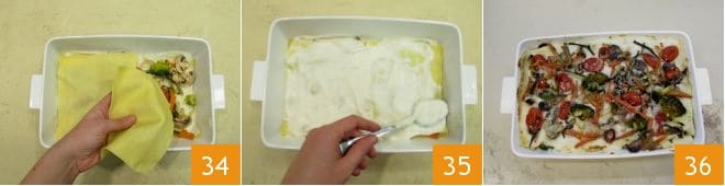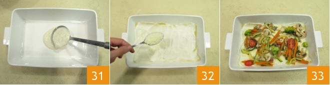 Wenn die Pasta gekocht ist, nehmen Sie eine Form von 30x20 cm, fügen 2 oder 3 Esslöffel Bechamelsauce hinzu 31 und verteilen Sie sie auf dem Boden der Form. Legen Sie 2 Rechtecke von Pasta nebeneinander, dann bedecken Sie sie mit weiterer Bechamelsauce, streuen Sie etwas geriebenen Käse darüber 32 und fügen Sie ein Drittel des Gemüses hinzu 33.