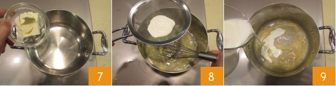 Bereiten Sie inzwischen die Bechamelsauce vor: Geben Sie die Butter in einen Topf 7, lassen Sie sie sanft schmelzen und fügen Sie dann das gesiebte Mehl hinzu, schnell rührend 8. Sobald Sie eine haselnussfarbene Mehlschwitze erhalten haben, fügen Sie die heiße Milch hinzu 9 und rühren Sie weiter.