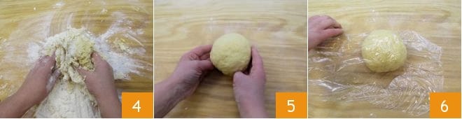 Zu diesem Zeitpunkt den Teig auf eine Arbeitsfläche geben und weiterkneten 4, wobei Sie bei Bedarf das beiseitegestellte Mehl hinzufügen, bis Sie einen glatten, festen und elastischen Teig erhalten, dem Sie eine kugelförmige Form geben 5. Wickeln Sie ihn in Frischhaltefolie 6 und lassen Sie ihn etwa 30-60 Minuten an einem kühlen und trockenen Ort außerhalb des Kühlschranks ruhen.