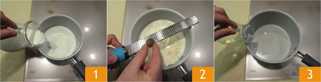 Um die Pfannen-Lasagne zuzubereiten, beginnen Sie mit der Béchamelsoße. Gießen Sie die Milch in einen kleinen Topf 1, würzen Sie mit Muskatnuss, schalten Sie den Herd an und erhitzen Sie die Milch 2. In einem anderen kleinen Topf gießen Sie das Pflanzenöl 3.