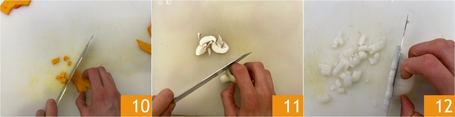 In der Zwischenzeit kümmern Sie sich um das Gemüse. Schneiden Sie den gereinigten Kürbis in Würfel 10, die Champignons in Streifen 11 und hacken Sie die Zwiebel 12.