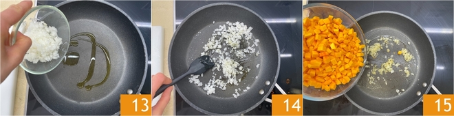 In einer beschichteten Pfanne geben Sie das Olivenöl und fügen die gehackte Zwiebel hinzu 13. Lassen Sie sie zwei Minuten bei mittlerer Hitze unter Rühren mit einem Spatel anschwitzen 14. Jetzt fügen Sie die Kürbiswürfel hinzu 15.