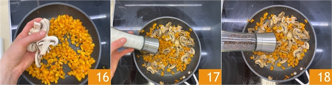 Geben Sie auch die Champignons hinzu 16, würzen Sie mit einer Prise Salz 17 und frisch gemahlenem schwarzen Pfeffer 18. Kochen Sie alles für 7 Minuten und stellen Sie es beiseite.