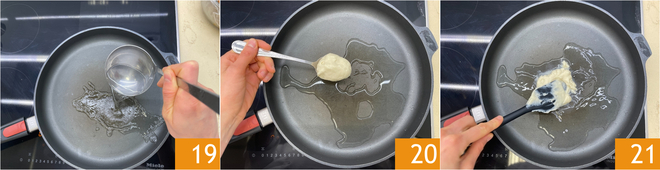 In einer großen, beschichteten Pfanne geben Sie eine Kelle Wasser 19 und einen Esslöffel Béchamelsoße 20, verteilen Sie sie mit einem kleinen Spatel über die gesamte Fläche 21.