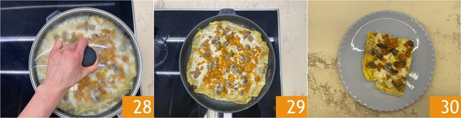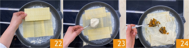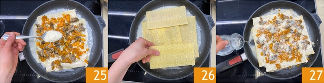 Beginnen Sie, die Eiernudelblätter auszulegen 22, gießen Sie eine Schicht Béchamelsoße 23 und fügen Sie die Zwiebel-, Kürbis- und Pilzfüllung hinzu 24.