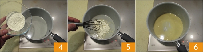 Fügen Sie dem heißen Öl das Mehl hinzu 4 und beginnen Sie mit einem Schneebesen zu rühren 5. Nach zwei Minuten Kochzeit erhalten Sie eine homogene Konsistenz, ähnlich einem Roux, aber heller 6.