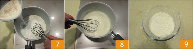 Gießen Sie langsam die heiße Milch dazu und beginnen Sie, die Béchamelsoße unter Rühren mit einem Schneebesen zu kochen 7. Lassen Sie sie weiter eindicken, bis die Béchamelsoße fast zu kochen beginnt 8. Sobald sie eingedickt ist, geben Sie sie in eine mit Frischhaltefolie bedeckte Schüssel 9.