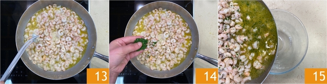 Entfernen Sie den Knoblauch 13 und fügen Sie eine Handvoll gehackte Petersilie hinzu 14, dann überführen Sie die Garnelen und den Fond in eine Schüssel und stellen sie zur Seite 15.