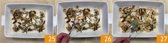 Bedecken Sie sie mit einer dünnen Schicht Bechamelsauce und einem Teil der Pilze 25. Verteilen Sie darauf eine Portion Garnelen 26, fügen Sie ein paar Löffel von ihrem Saft hinzu, um den Geschmack zu intensivieren 27.