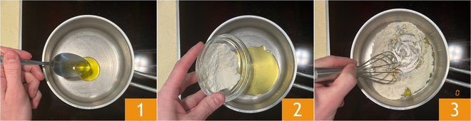 Um die Lasagne mit Garnelen und Pistazien zuzubereiten, beginnen Sie mit der Bechamelsauce mit Öl: Erhitzen Sie das Öl in einem Topf 1, dann fügen Sie das Mehl hinzu 2. Rühren Sie um und bilden Sie das Roux, lassen Sie es 1-2 Minuten anbräunen 3.