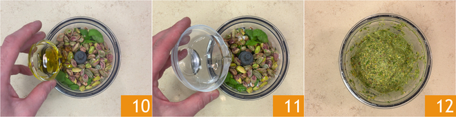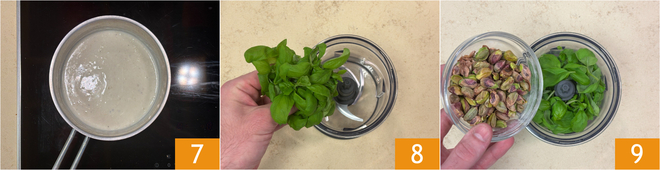 Sobald sie fertig ist, decken Sie die Bechamelsauce mit Frischhaltefolie ab und stellen Sie sie beiseite. Bereiten Sie das Pistazienpesto zu 7: Geben Sie die sauberen Basilikumblätter 8 und die Pistazien 9 in den Mixer.