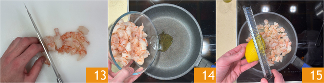Kümmern Sie sich nun um die Garnelen: Hacken Sie sie grob mit einem Messer 13, dann braten Sie sie kurz in einer Pfanne mit etwas Öl an 14. Aromatisieren Sie mit der Zitronenschale 15.