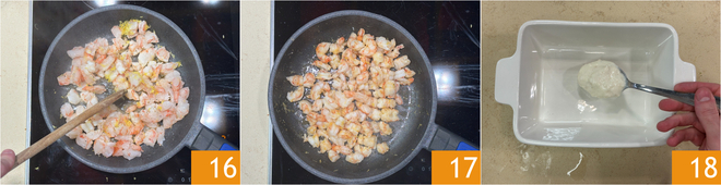 Rühren Sie um, um den Geschmack zu intensivieren 16 und schalten Sie die Hitze aus, sobald die Garnelen ihre Farbe geändert haben 17. Sie sind bereit, die Lasagne zu schichten: Verteilen Sie etwas Bechamelsauce auf dem Boden einer Auflaufform von 20x16 cm 18.