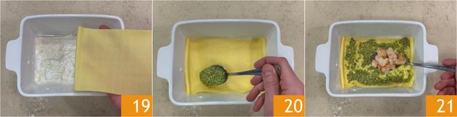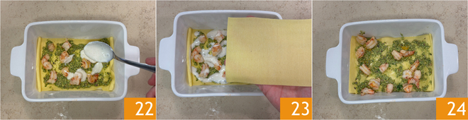 Verteilen Sie etwas Bechamelsauce 22, dann fahren Sie mit einem weiteren Stück Teig fort 23, Pistazienpesto, Garnelen 24 und Bechamelsauce. Fahren Sie so fort, bis die Zutaten verbraucht sind 24.