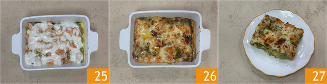 Beenden Sie mit einer Schicht Bechamelsauce 25 und backen Sie bei 180° etwa 20 Minuten lang, dann grillen Sie weitere 5 Minuten bei 230°, um die Oberfläche zu bräunen 26. Ihre Lasagne mit Garnelen und Pistazien ist bereit zum Servieren 27!