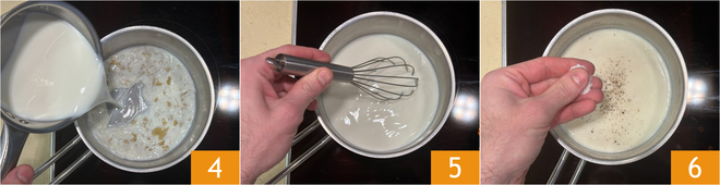 Gießen Sie nun die warme Milch hinzu 4 und rühren Sie mit dem Schneebesen weiter auf dem Herd, bis die Sauce eindickt 5. Würzen Sie mit Muskatnuss und Salz 6.
