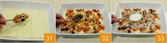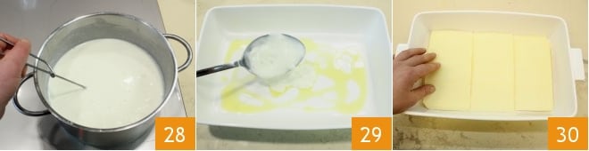 Dann weiter mit dem Schneebesen rühren, um die Béchamel bei niedriger Hitze zu verdicken 28. Nehmen Sie eine Auflaufform von 30x20 cm und beträufeln Sie sie mit einem Schuss Öl; verteilen Sie eine Schicht Béchamel 29 und legen Sie eine Schicht Lasagne darauf 30.