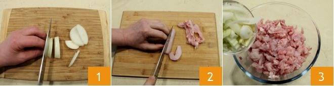 Sie können sie mit etwas Fleischbrühe 10 verlängern, um das Garen zu erleichtern, aber sie sollten nur wenige Minuten kochen, damit sie knackig bleiben; würzen Sie mit Salz und Pfeffer, fügen Sie die gehackte Petersilie hinzu 11, mischen Sie und schalten Sie das Feuer aus. Jetzt das Kaninchenragout vorbereiten: Nehmen Sie die Zwiebel, den halben Stangensellerie und eine Karotte 12, um sie fein zu hacken.