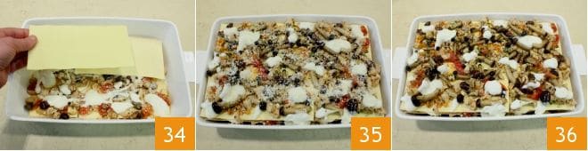 Beginnen Sie mit einer weiteren Lasagneschicht 34 und fahren Sie in der gleichen Reihenfolge fort, bis die Zutaten aufgebraucht sind, wobei Sie mit Parmesankäse und einigen Esslöffeln Béchamel bestreuen 35. Dann backen Sie die Lasagne im vorgeheizten statischen Ofen bei 200° für 30 Minuten (bei Umluftofen bei 180° für etwa 20 Minuten). Sobald sie gebacken sind, aus dem Ofen nehmen 36 und heiß servieren!