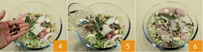 die Salbeiblätter, die Rosmarinzweige, die Thymianblätter, die Wacholderbeeren 4; dann alles mit dem Weißwein bedecken 5 und mindestens zwei Stunden oder die ganze Nacht marinieren lassen 6, mit Frischhaltefolie abgedeckt und im Kühlschrank.