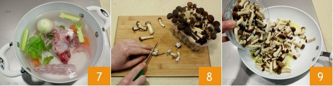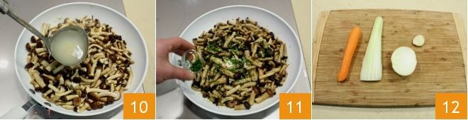 Für die Brühe das Wasser in einen Topf gießen, dann die Kaninchenknochen, die Zwiebel, den Sellerie, die Karotte und eine Prise Salz hinzufügen: mindestens 1 Stunde bei sehr niedriger Hitze köcheln lassen. In der Zwischenzeit widmen Sie sich den Pilzen: Reinigen Sie die Pilze, indem Sie das Endstück abschneiden 8, waschen Sie sie; dann blanchieren Sie sie für 15-20 Minuten, bevor Sie sie in eine große Pfanne geben, in der Sie leicht gehackten Knoblauch mit einem Schuss Öl angebraten haben 9.
