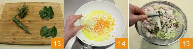 Führen Sie die gleiche Operation auch mit Knoblauch, Salbei, Thymian, Lorbeer, Rosmarin durch 13. Träufeln Sie einen Schuss Öl in eine große Pfanne, dann fügen Sie das Zwiebel-Sellerie-Karotten-Gemisch und die Knoblauchzehe hinzu 14 und lassen Sie das Soffritto bei niedriger Hitze anbraten. Lassen Sie das Kaninchen sorgfältig aus der Marinade abtropfen und entfernen Sie die Aromen 15.