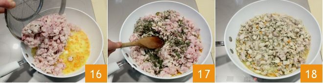 Wenn das Soffritto gewelkt ist, fügen Sie das Kaninchen 16 und die gehackten aromatischen Kräuter hinzu 17, dann 10-15 Minuten anbraten lassen 18.