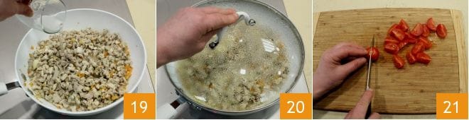 Löschen Sie das Fleisch mit Weißwein ab 19, lassen Sie ihn verdampfen, dann fügen Sie ab und zu die Kaninchenbrühe hinzu, indem Sie mit dem Deckel kochen 20, bis das Fleisch schön zart ist: Das dauert etwa 1 Stunde. Gegen Ende der Garzeit waschen Sie die Kirschtomaten und schneiden Sie sie in Spalten 21,