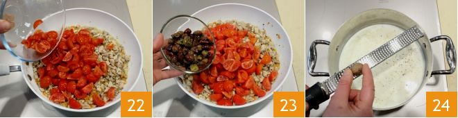 fügen Sie sie dem Kaninchenragout hinzu 22, dann geben Sie auch die entsteinten Taggiasca-Oliven hinzu 23. Würzen Sie mit Salz und Pfeffer und schalten Sie dann das Feuer aus. Widmen Sie sich dann der Béchamel: erhitzen Sie die Milch in einem Topf, würzen Sie sie mit frisch geriebener Muskatnuss 24 und salzen und pfeffern Sie nach Belieben.