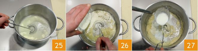 In einem anderen großen Topf die Butter schmelzen lassen 25; sobald sie geschmolzen ist, das Mehl einstreuen 26 und mit einem Schneebesen verrühren, um eine Mehlschwitze zu erstellen. Wenn die Mischung leicht dunkel geworden ist und sich verdickt hat, die heiße Milch hineingießen 27.