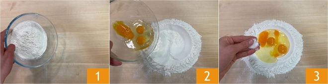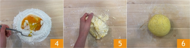 Mit einer Gabel die Eier aufbrechen und mit dem Mehl vermischen 4. Mit den Händen arbeiten 5, bis ein glatter und homogener Teig entsteht 6. Den Teig in Frischhaltefolie einwickeln und beiseitelegen.