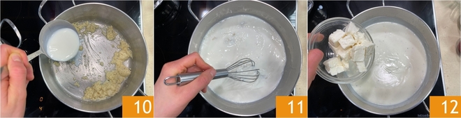 Wenn ein Roux entsteht, die heiße Milch einfüllen 10 und gut mit dem Schneebesen mischen, um Klumpenbildung zu vermeiden 11. Die Mischung bei schwacher Hitze unter ständigem Rühren eindicken lassen, dann den Herd ausschalten und den Taleggio in Stückchen hinzufügen 12.