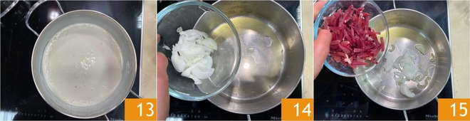 Die Béchamelsauce beiseite stellen, mit Frischhaltefolie abdecken 13. Jetzt das Öl in einem Topf erhitzen, die in Streifen geschnittenen Zwiebeln 14 und den in Streifen geschnittenen Speck hinzufügen. Bei mittlerer Hitze etwa 2-3 Minuten kochen 15.