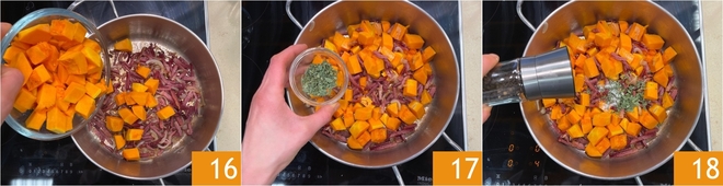 Wenn der Speck knusprig ist, die in Würfel geschnittenen Kürbisstücke hinzufügen 16. Mit Salz, dem gehackten Salbei 17 und einer Prise schwarzem Pfeffer abschmecken 18. Bei mittlerer Hitze etwa 10-15 Minuten kochen, bis der Kürbis weich ist.