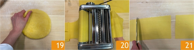 Den Teig zurücknehmen und zunächst mit dem Nudelholz ausrollen 19, dann durch die Nudelmaschine führen, bis Sie 2 mm dicke Blätter erhalten 20. Schneiden Sie das Nudelblatt in Rechtecke, die die gleiche Größe wie die Auflaufform haben 21; wir haben eine Form von 26x19 cm verwendet.