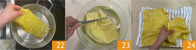 Die Nudelrechtecke etwa 2 Minuten lang in kochendem Wasser blanchieren 22, dann in einer Schüssel mit Wasser und Eis abtropfen lassen, um das Kochen zu stoppen 23. Legen Sie die Blätter schließlich auf ein Küchentuch 24.