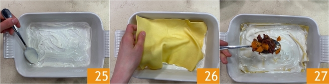 Sie sind bereit, die Lasagne zusammenzustellen: Den Boden einer Auflaufform mit einer dünnen Schicht Béchamelsauce bestreichen 25, dann das erste Nudelrechteck auflegen 26. Mit weiterer Béchamelsauce bedecken und die Kürbis-Speck-Mischung verteilen 27.