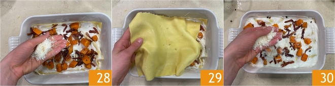 Mit geriebenem Parmigiano Reggiano bestäuben 28 und mit einer weiteren Schicht Nudeln fortfahren 29, auf diese Weise weiter, bis alle Zutaten verbraucht sind 30. Insgesamt sollten Sie 5 Schichten erhalten.