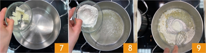 Fahren Sie mit der Taleggio-Béchamelsauce fort: Erhitzen Sie die Milch in einem kleinen Topf und schmelzen Sie die Butter in einem separaten Topf 7. Fügen Sie das Mehl auf einmal zur geschmolzenen Butter hinzu 8 und rühren Sie schnell mit einem Schneebesen um 9.