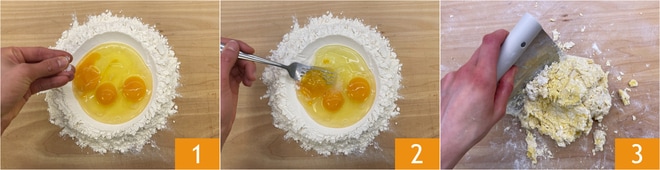 Um die Lasagne mit Pesto aus der Mikrowelle zuzubereiten, beginnen Sie mit der Zubereitung der frischen Pasta: Auf einer Arbeitsfläche formen Sie einen Mehlbrunnen, schlagen die Eier in die Mitte, fügen eine Prise Salz hinzu 1 und schlagen sie schnell 2. Vermengen Sie die Mischung mit Hilfe eines Schabers 3.