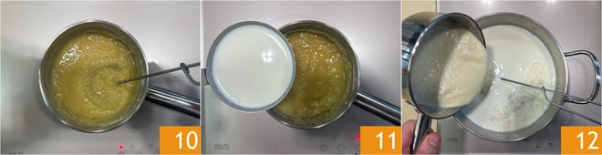 Rühren Sie bei mittlerer Hitze mit einem Schneebesen, um Klumpenbildung zu vermeiden 10. Wenn Sie eine haselnussfarbene Mischung erhalten haben, fügen Sie einen Teil der heißen Milch hinzu, um zu mischen 11, rühren Sie und gießen Sie alles in den restlichen Teil der Milch 12. Lassen Sie es bei schwacher Hitze kochen, bis Sie eine dickflüssige Sauce erhalten, und stellen Sie sie dann beiseite.