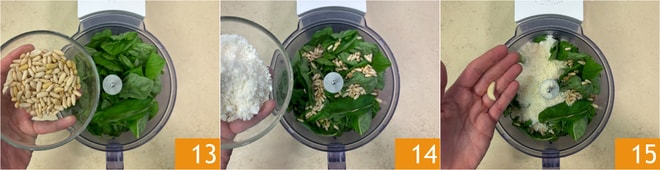 Bereiten Sie schließlich das Pesto zu: In einem Mixer geben Sie das Basilikum, dann fügen Sie die Pinienkerne 13, den Parmesan, den Pecorino 14 und den Knoblauch 15 hinzu.