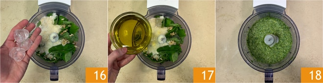 Fügen Sie auch das Eis 16, das Öl 17 hinzu und würzen Sie mit Salz. Mixen Sie in Intervallen, um die Mischung nicht zu stark zu erhitzen, bis Sie eine cremige Konsistenz 18 erhalten.