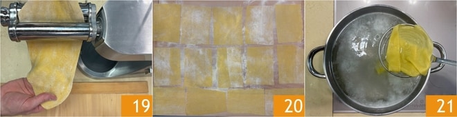 Nehmen Sie den Teig und teilen Sie ihn, damit er leichter zu handhaben ist. Rollen Sie den Teig mit Hilfe einer Nudelmaschine aus 19, regulieren Sie dabei nach und nach die Dicke, bis Sie eine Dicke von 1-2 mm erreichen. Schneiden Sie die Blätter in Rechtecke von 15x10 cm 20, dann kochen Sie sie kurz in Salzwasser 21.