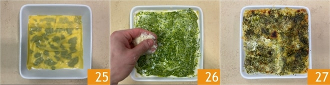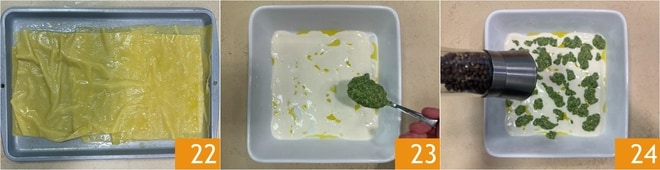 Legen Sie die Blätter auf ein leicht geöltes Backblech und lassen Sie sie abkühlen 22. Bauen Sie die Lasagne in einem 25x25 cm großen Backblech auf, indem Sie den Boden mit einem Schuss Öl und einer Kelle Béchamelsauce bedecken, dann mit dem Pesto fortfahren 23 und etwas Pfeffer hinzufügen 24.