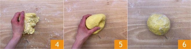 Dann arbeiten Sie weiter mit den Händen 4, bis Sie einen glatten und homogenen Teig haben 5. Decken Sie ihn mit Frischhaltefolie ab und lassen Sie ihn 15 Minuten im Kühlschrank ruhen 6.