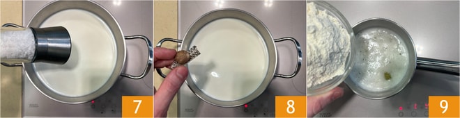 Fahren Sie mit der Béchamelsauce fort. Erwärmen Sie die Milch in einem Topf, fügen Sie Salz 7 und Muskatnuss hinzu 8. In einem kleinen Topf bereiten Sie das Roux zu: Schmelzen Sie die grob geschnittene Butter, dann fügen Sie das Mehl hinzu 9.