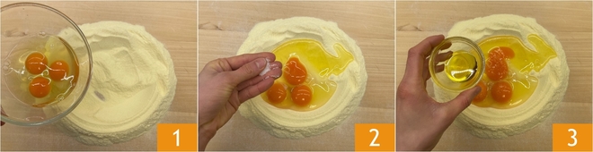 Um die Lasagne mit Radicchio zuzubereiten, beginnen Sie mit der frischen Pasta: Geben Sie den Hartweizengrieß auf die Arbeitsfläche und formen Sie eine Mulde, dann fügen Sie in der Mitte die Eier 1, eine Prise Salz 2 und das Öl 3 hinzu.