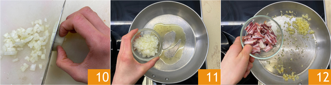 Putzen und hacken Sie die Zwiebel fein 10. Geben Sie die Zwiebel in eine Pfanne mit einem Schuss heißem Öl 11 und lassen Sie sie einige Minuten braten. Wenn sie weich und durchsichtig geworden ist, fügen Sie den Speck hinzu 12.