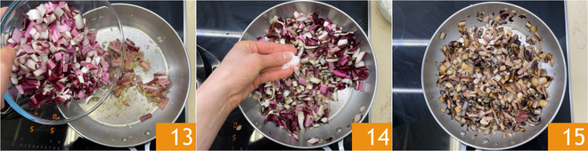 Braten Sie den Speck eine Minute lang an, dann fügen Sie den Radicchio hinzu 13 und salzen Sie 14. Kochen Sie auf mittlerer Flamme für 10-15 Minuten, bis der Radicchio zart ist. Schalten Sie die Flamme aus und lassen Sie abkühlen 15.